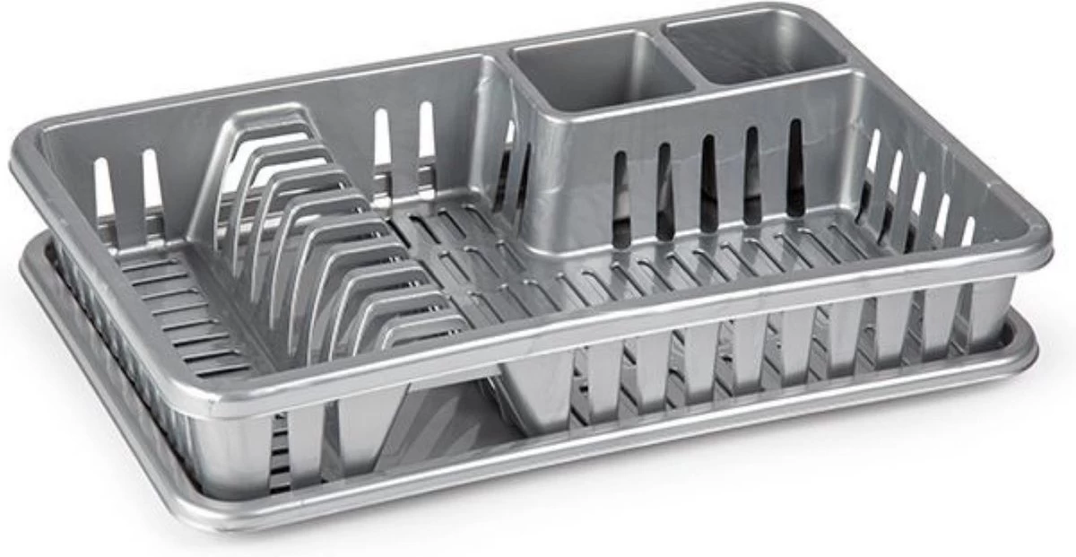 Een antraciet grijs afwasrek/afdruiprek, met lekbak om het water op te vangen zodat niet het hele aanrecht nat wordt. Het rek heeft ruimte voor 9 borden, 2 bestekbakken en naast de borden kunt u nog glazen/bekers kwijt. U kunt het rek van de lekbak halen, om beide afzonderlijk droog te kunnen maken. Afmeting: ca. 45 x 30 x 8 cm. Materiaal: kunststof. Keukenbenodigdheden – Afwassen/afdrogen – Afwasrekken – Afdruiprekken met lekbak.