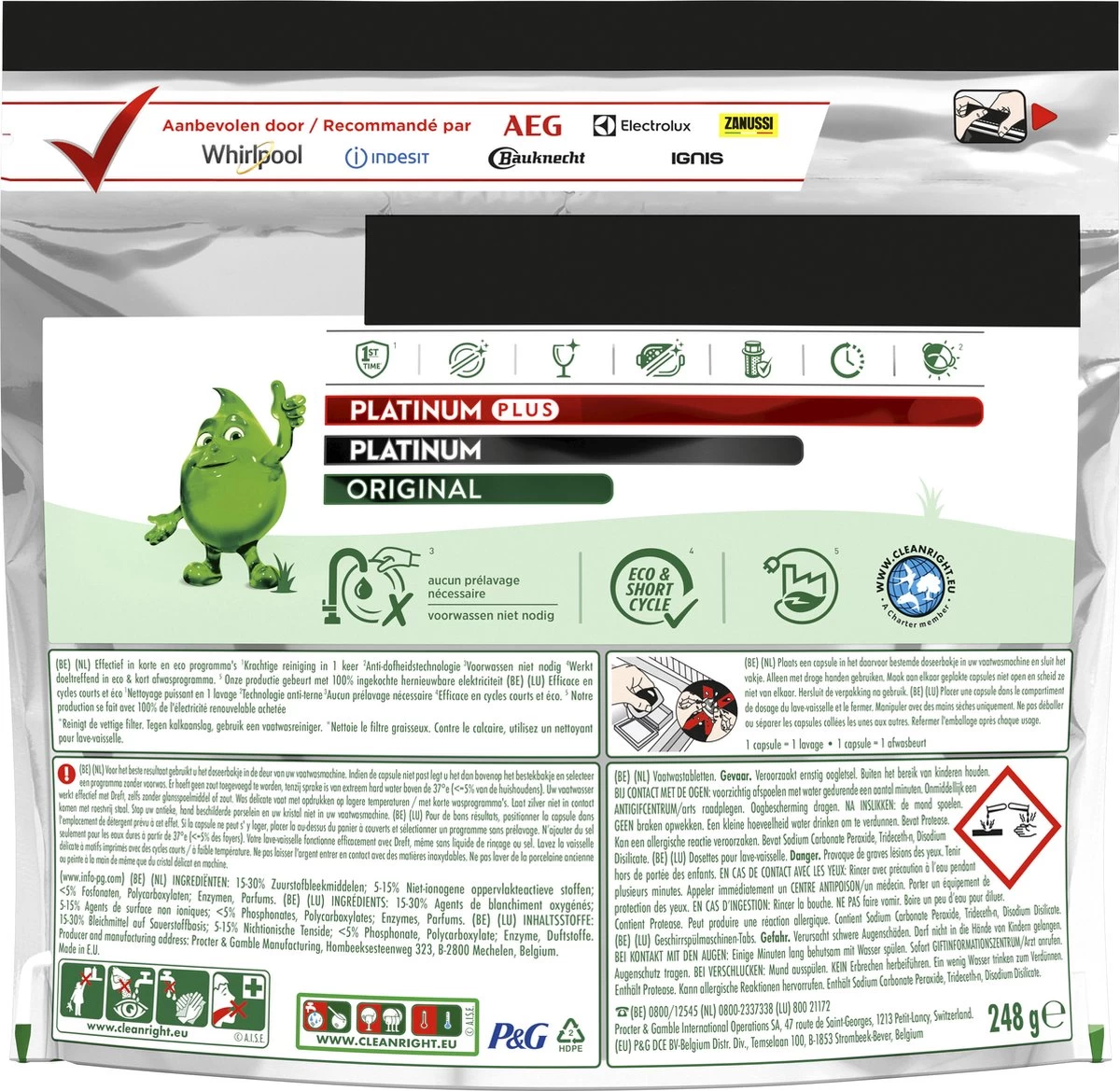 De Platinum Plus All in One Vaatwastabletten van Dreft leveren een reiniging als nieuw en geven je het beste reinigingsresultaat voor hardnekkig voedsel. En met de Platinum Plus Machine Clean Action van Dreft krijg je ook nog eens een glanzende machinereiniging! Dreft Platinum Plus geeft een uitmuntende reiniging en verwijdert hardnekkige voedselvlekken, zelfs in de zware testconditie van een korte cyclus. Dus ook al heb je weinig tijd, is er niets aan de hand. Schakel over op kort. Dreft combineert vloeistof en poeder in één krachtige capsule. Het oplosbare zakje lost zeer snel op en werkt ook goed bij korte cycli omdat het meteen begint met de reinigingstaak. En ze zijn gemakkelijk te gebruiken! Je hoeft ze niet uit te pakken, plaats ze gewoon in je vaatwasmiddelbakje. Schakel over op de korte cyclus en bespaar tijd, energie en water in vergelijking met een gewone, standaard cyclus.