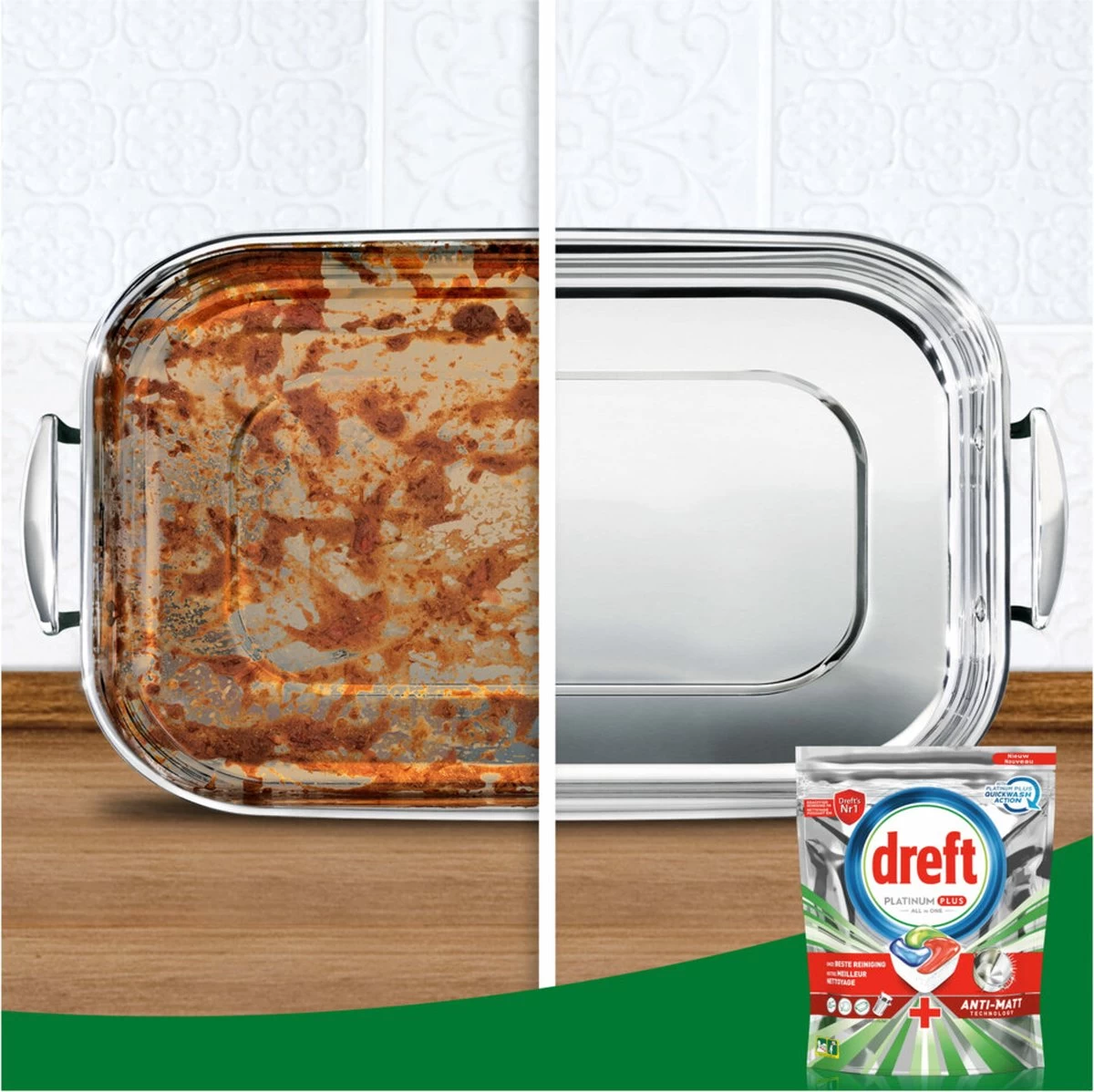 Dreft Platinum Plus All in One vaatwascapsules leveren een zo goed als nieuwe vaat. Ze leveren de beste reiniging van Dreft en helpen zelfs de dofheid die na verloop van tijd is opgebouwd weg te nemen om de oorspronkelijke glans van je vaat te herstellen. Dreft Platinum Plus heeft een geïntegreerd voorwassysteem en doet het voorwasprogramma voor je. Met Dreft Platinum Plus hoef je niet voor te spoelen, zodat je water bespaart en milieuvriendelijker bent. Dreft combineert vloeistof en poeder in één krachtige capsule.