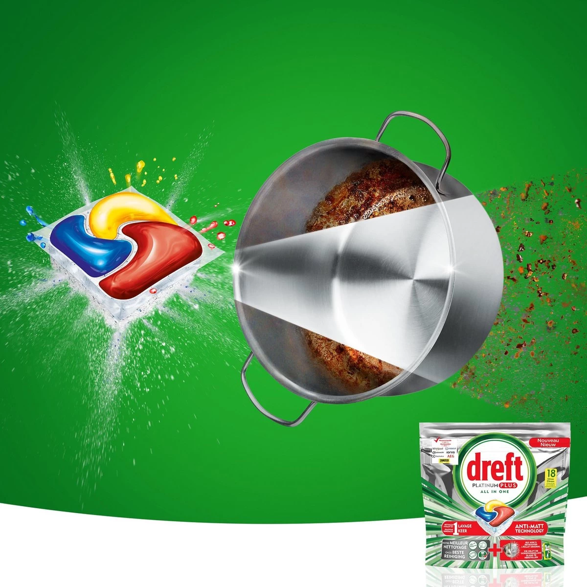 Dankzij Dreft Platinum vaatwastabletten kunt u koken wat u wilt want ze verwijderen zelfs de hardnekkigste etensresten. Dreft Platinum vaatwastabletten breken hardnekkige etensresten zoals pasta, rijst, eieren en vlees af, terwijl de unieke vloeibare bovenzijde van de tablet vet en olie aanpakt en niets anders dan een schone vaat achterlaat. Dreft Platinum helpt zelfs verborgen vetresten uit uw vaatwasser te verwijderen en laat uw vaat, en uw vaatwasser, stralend schoon achter.