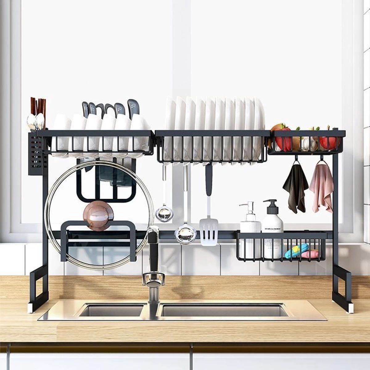 Bij het ontwerpen van dit rek hebben we met alles rekening gehouden. Zo is er een rek voor borden, schaaltjes en zelfs voor fruit. Daarnaast is er een houder waar je messen in kunt bewaren, een bestekbakje en een bakje voor je afwasmiddel, borstel en spons. Daarnaast is het rek gemaakt van stevig RVS, dat water bestendig is en lang mee gaat. Natuurlijk is het ontwerp ook zeer stevig, zodat je het prima permanent op je aanrecht kunt laten staan. Je kunt het rek zelfs op de lange termijn gebruiken om je serviesgoed op te bewaren, wanneer je een kleine keuken hebt met serieus ruimte te kort. Dit rek is ideaal en heeft ook nog eens een eigentijds design dat in elke keuken past.